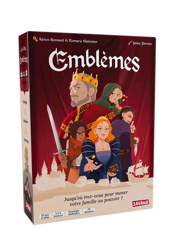 Dans Emblèmes, incarnez une famille ambitieuse qui doit imposer son influence sur trois lieux stratégiques du royaume : le Château, le Village et le Port. Chaque carte placée peut renverser la partie grâce à son effet unique et sa valeur de majorité.